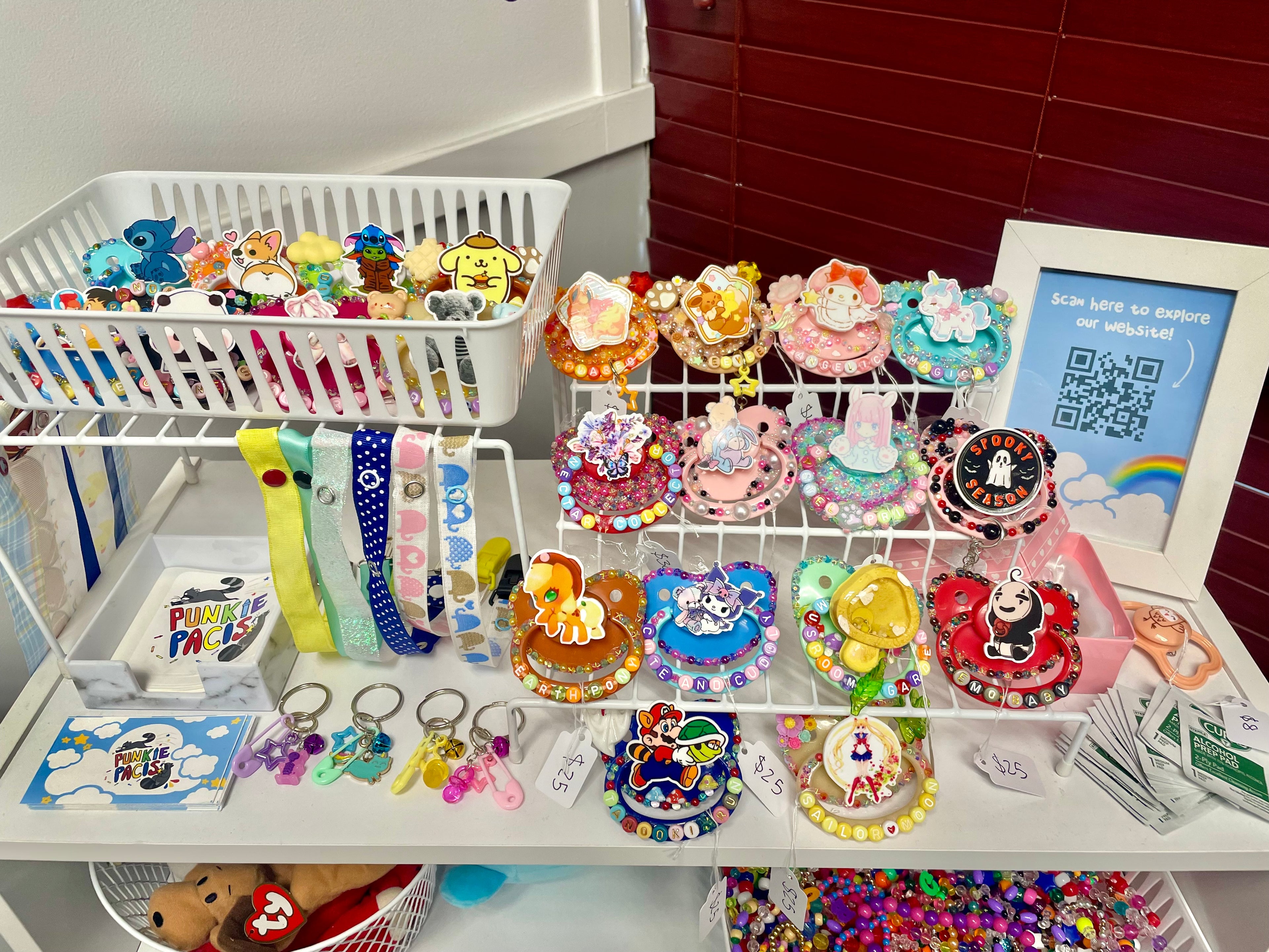 Check out our display, which is regularly stocked with pacifiers, stuffies, bracelets, and more. Be sure to browse the other amazing vendors!