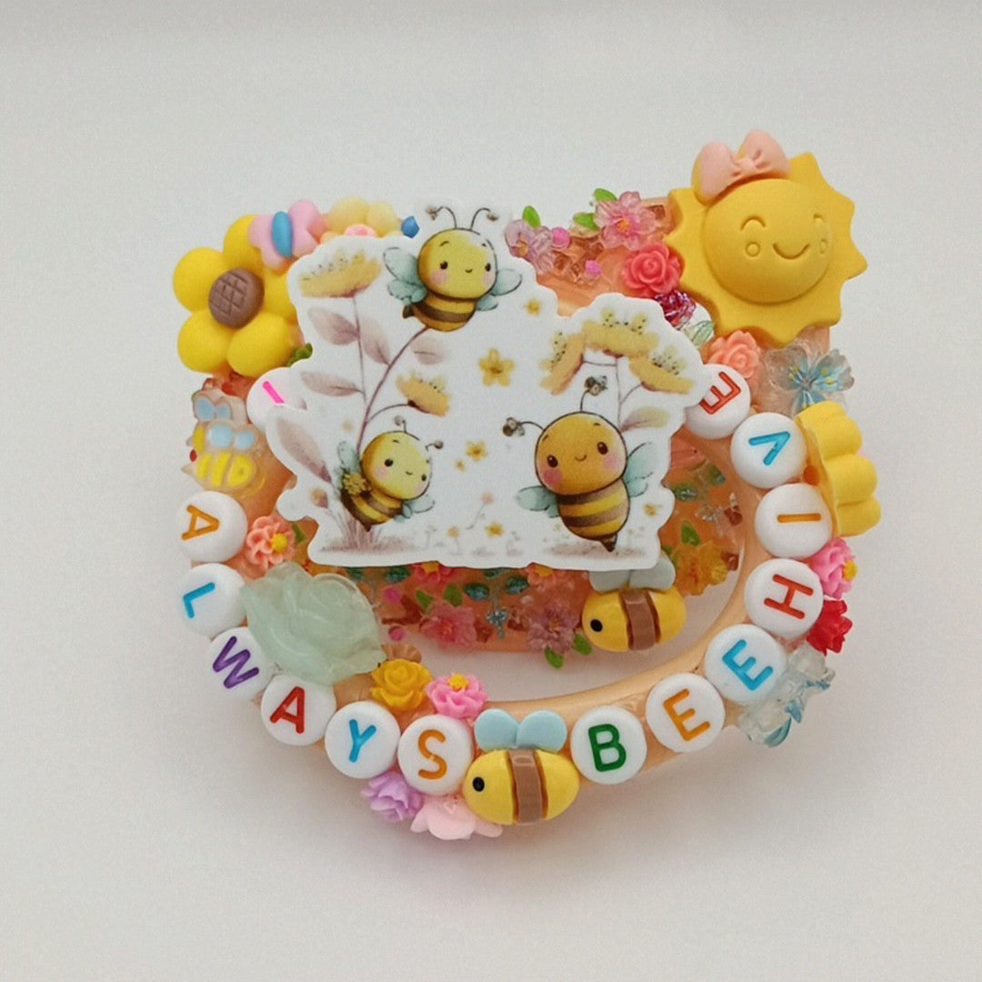 A Full deco pacifier with Flower, Sun, Bee add ons and “Always Beehive” in white/mixed colored lettering. Made by Marcy