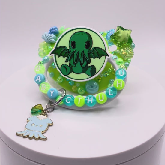 ミ★ A scatter deco paci with gummy bear, wave, fish, and star add ons, squid and seashell charms, and “Baby Cthulu” in teal and green lettering. Made by Ty