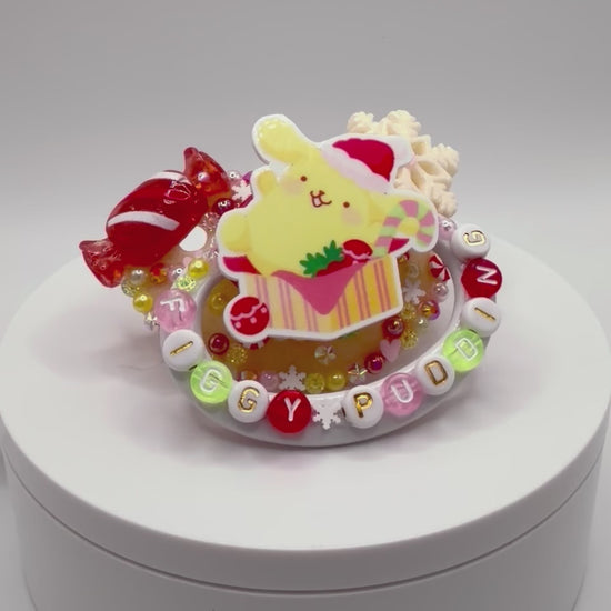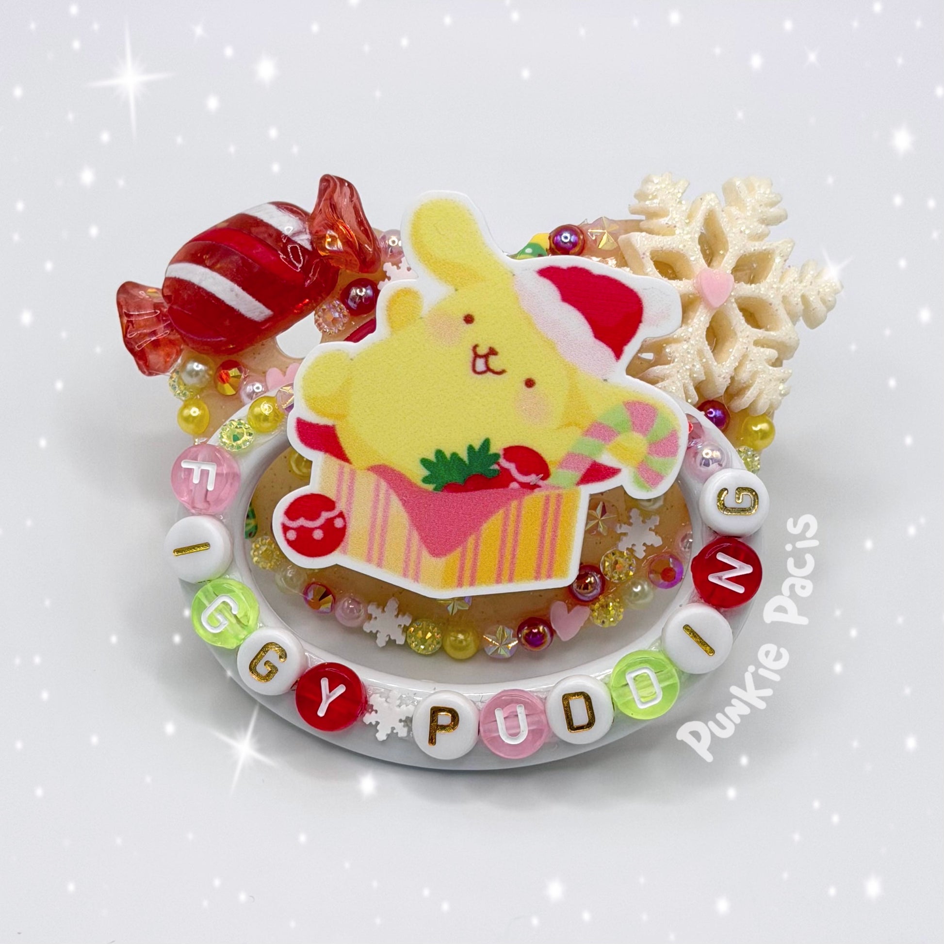 ミ★ A heavy scatter deco paci with candy and snowflake add ons, sprinkle deco, a clear reinforced teat with filler, and “Figgy Pudding” in pink, white, green, and red lettering. Made by Ty