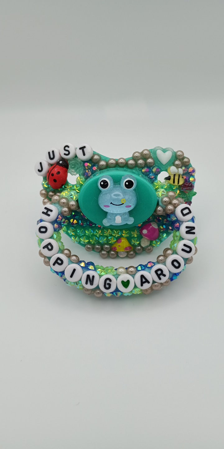 ミ★ A Deluxe Deco pacifier with frog center and “Just Hopping Around” in black and white lettering. Made by Marcy